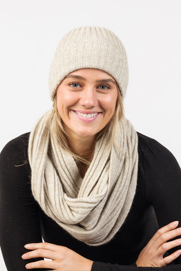 A ribbed detail finish creates a luxuriuosly warm and lofty loop scarf - pair with the ribbed beanie
