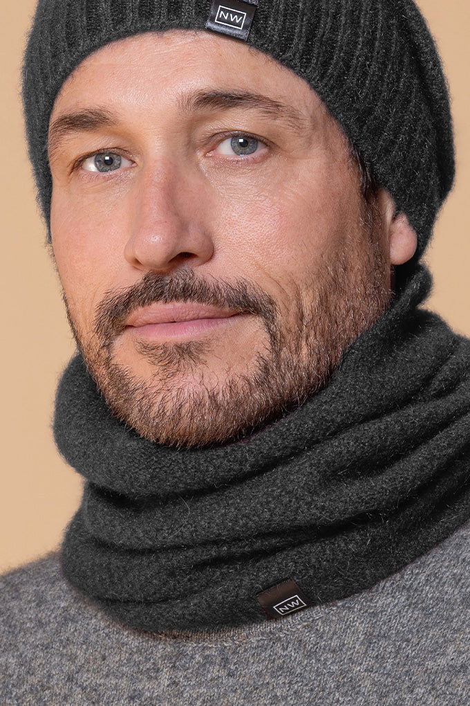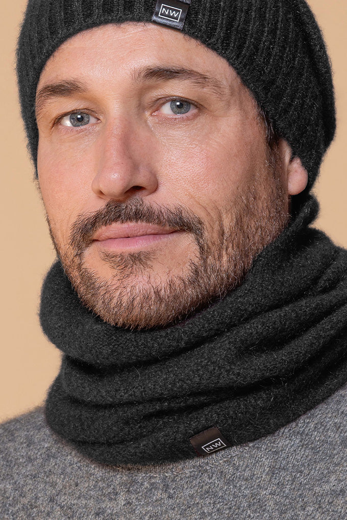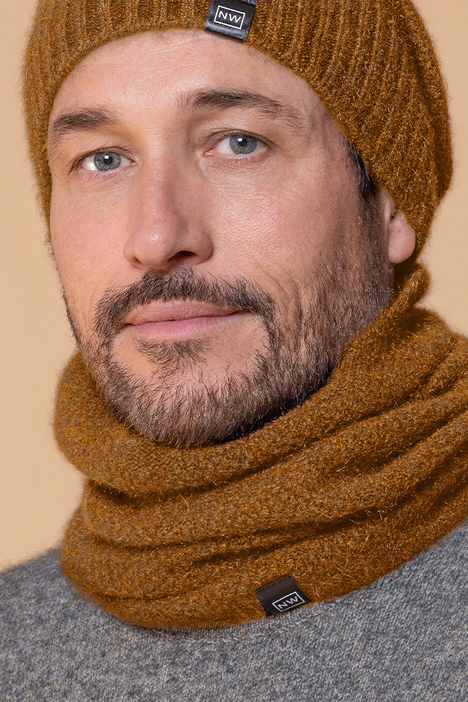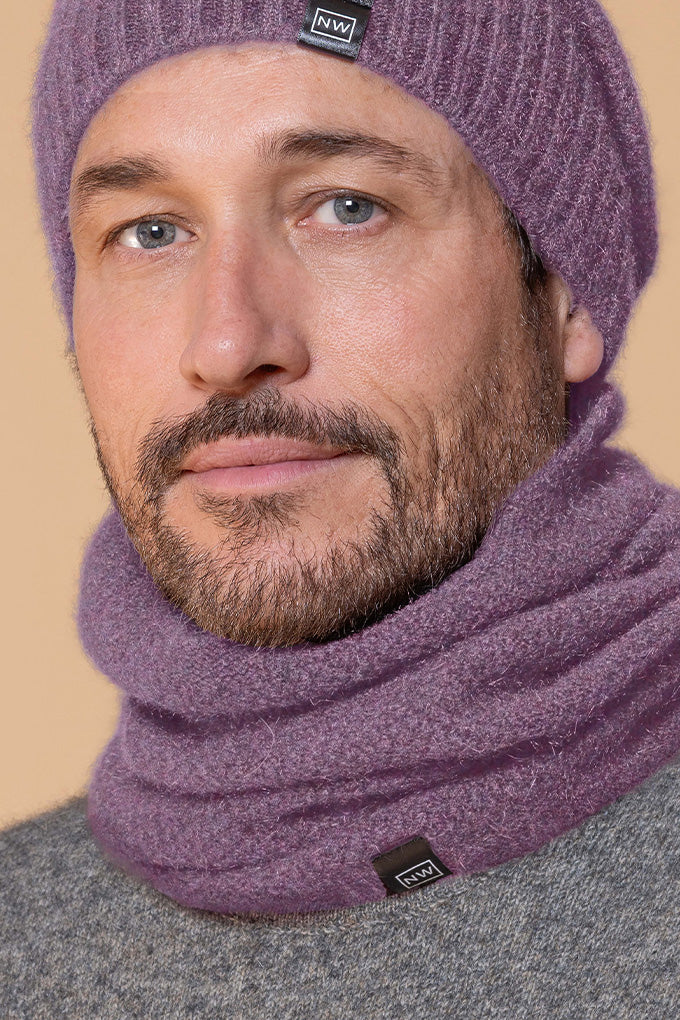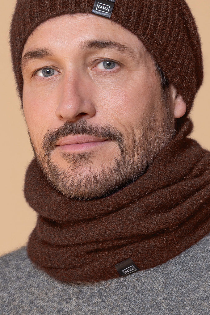 One piece neck warmer with moss stitch knit structure.