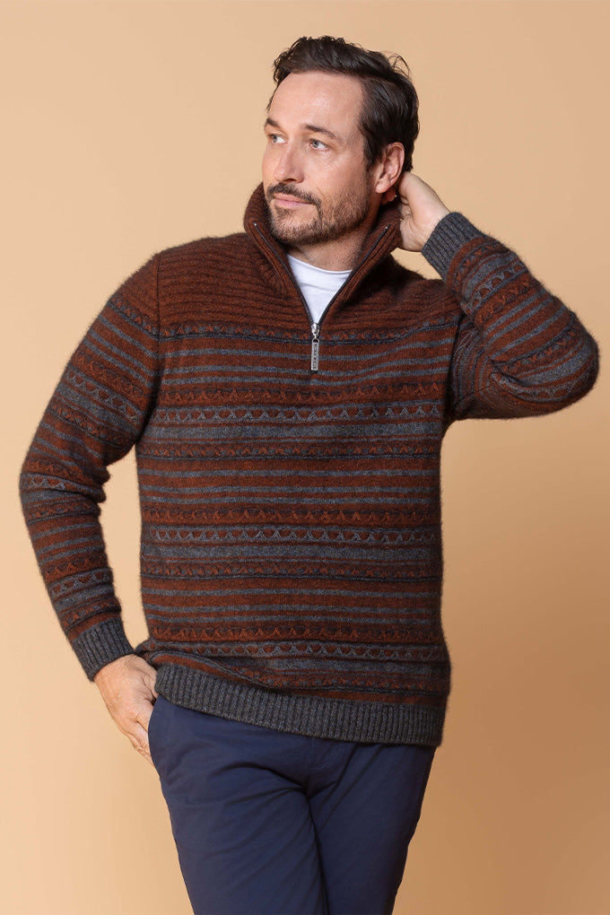 This zip neck jumper is knitted in a mix of textural patterns and a subtle mix of colours, blues, grey and brown which help create a garment with great masculine appeal. It features a sturdy double layered ribbed collar, set in sleeves and ribbed bands on the cuffs and around the lower edges of the back and front.