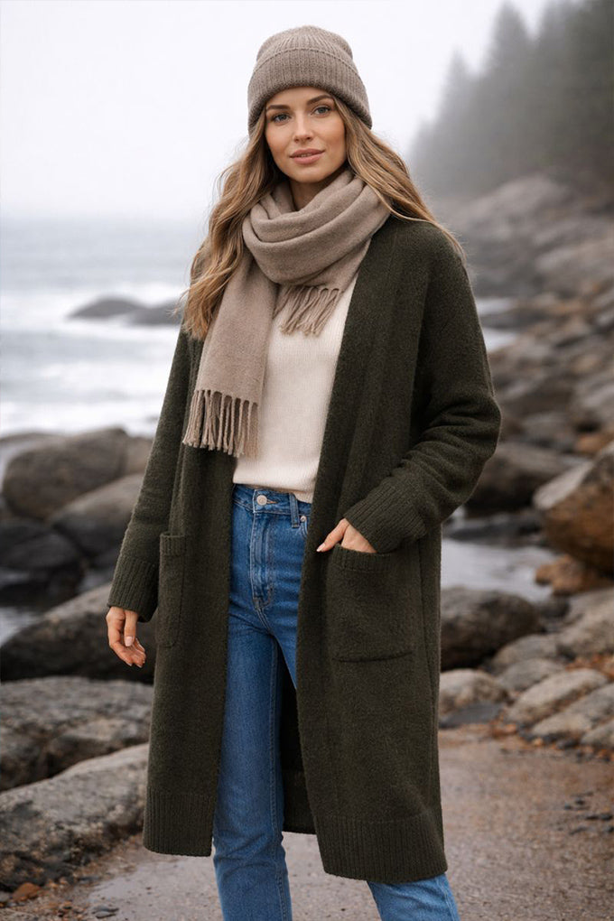 No wardrobe is complete without this versatile Longline relaxed fit cardigan. The cardigan features front pockets and a wide rib knit on the cuffs and hem that drapes to just above your knees. The cardigan makes a fantastic layer piece you can rely on all year round.