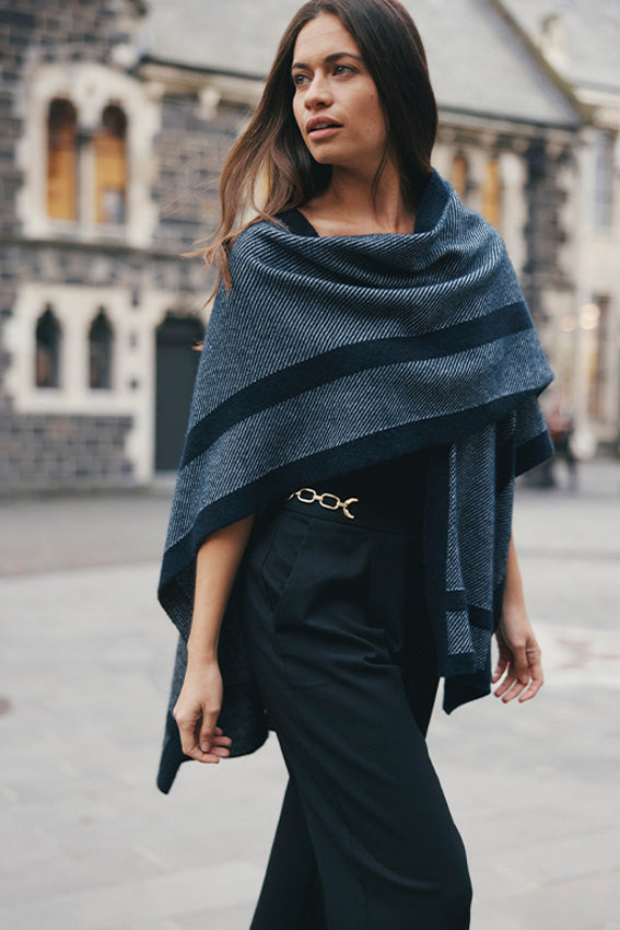 Wrap yourself up in style and sophistication. The Mari Wrap has form and function covered, with a beautiful textural knit and bold contrast panels. Easily styled in so many ways, this elegant piece is your perfect travel partner.