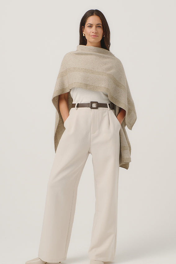 Wrap yourself up in style and sophistication. The Mari Wrap has form and function covered, with a beautiful textural knit and bold contrast panels. Easily styled in so many ways, this elegant piece is your perfect travel partner.