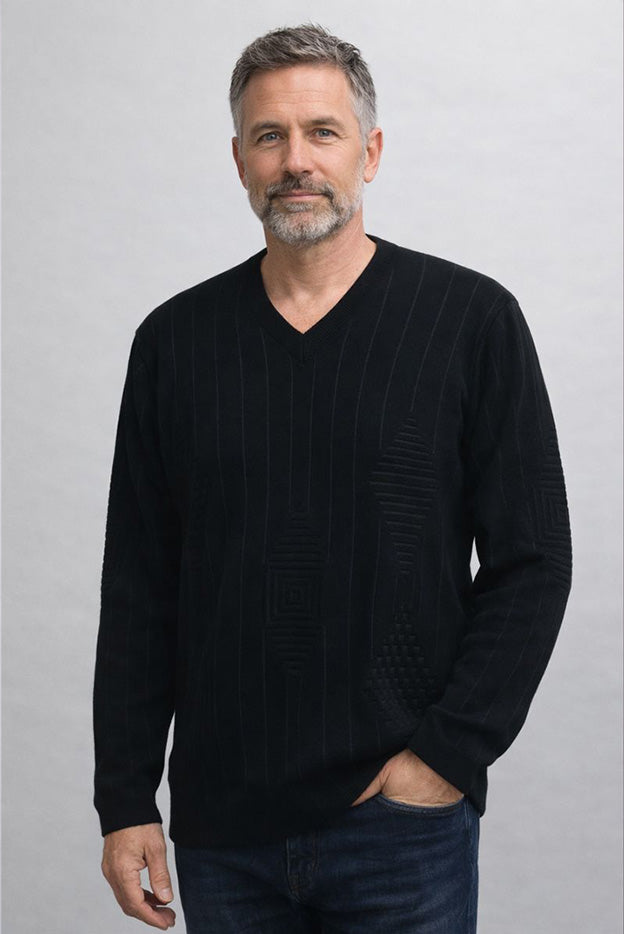 This is one of our most popular pullovers. It's a premium quality knit with design details for the more conservative man. The horizontal lines at chest, and intarsia squares create a sophisticated look that can be dressed up easily. Using 100% Australian Merino wool.